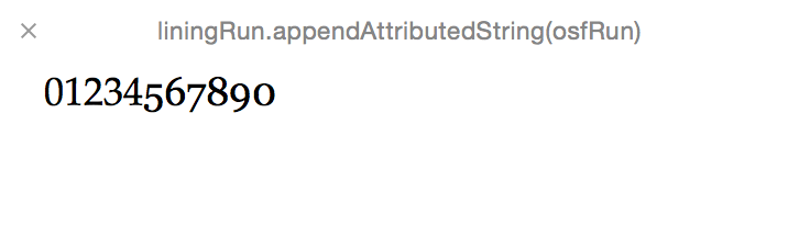 and whenever you need to use both of them, what you do is create and attributed string that contains a run of text whose font may be liningFont and then append a second run of text whose font is osfFont. In the abstract, i think this doesn't sounds totally crazy, but it is a bit verbose. the above example reads like this: