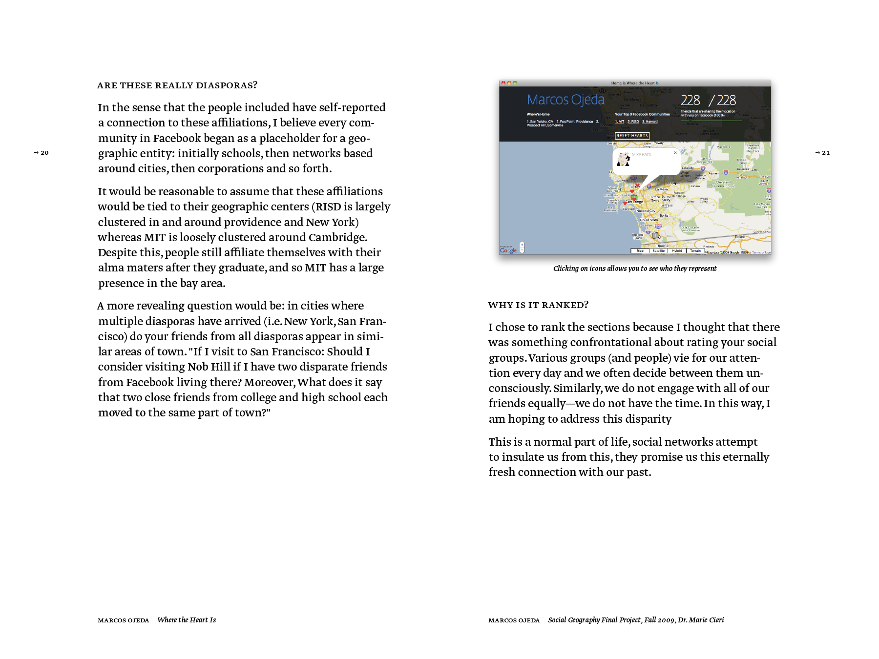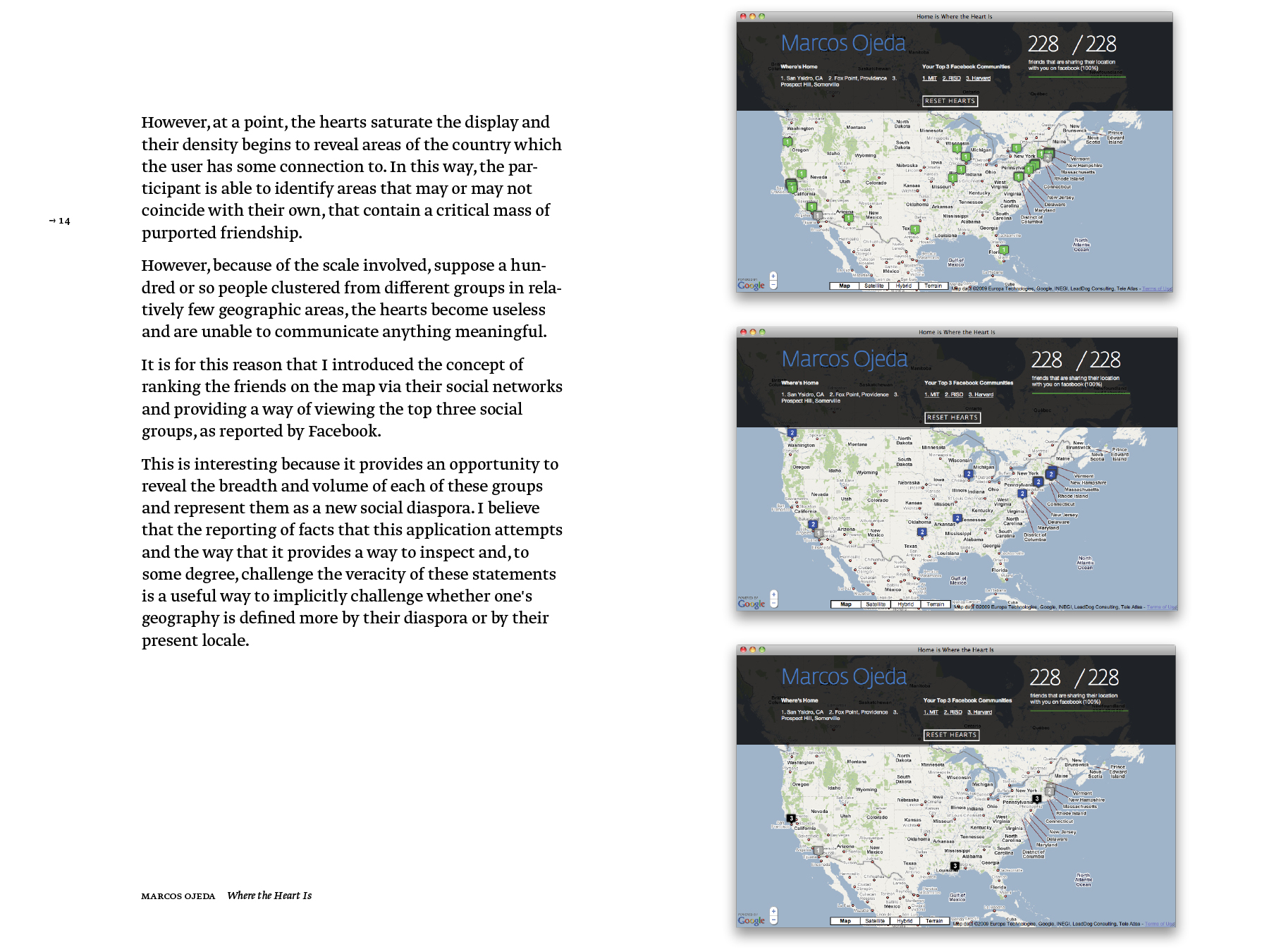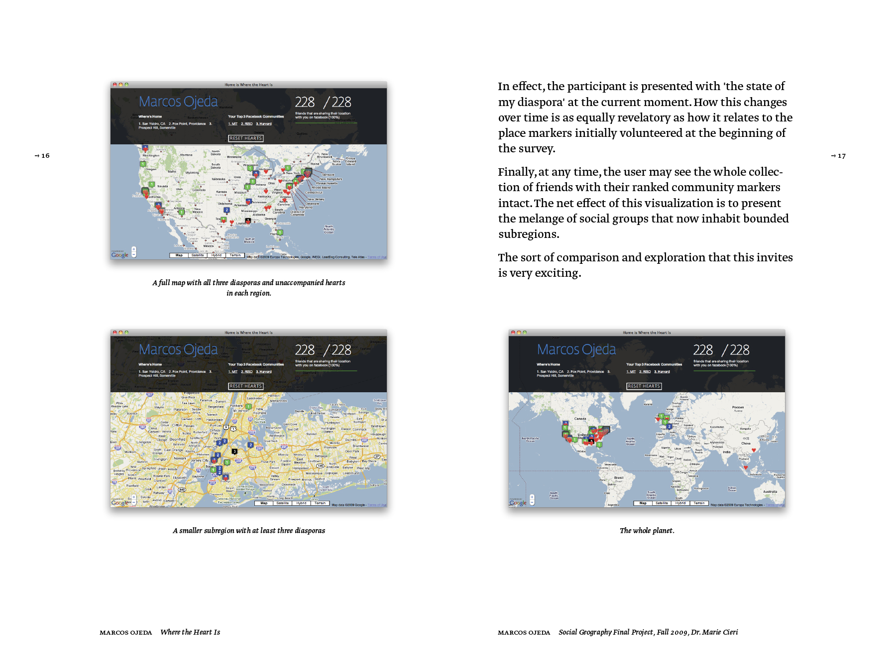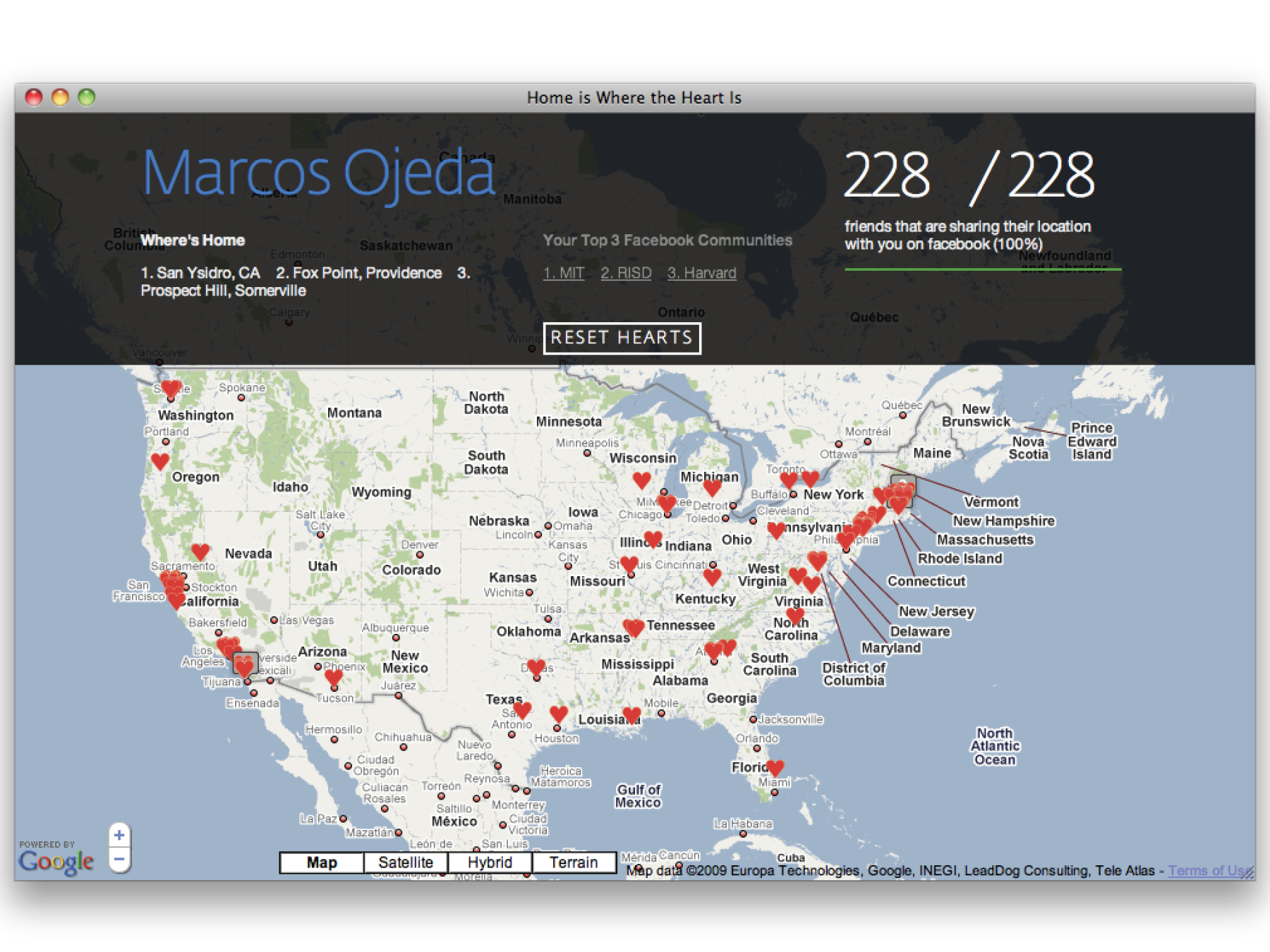 "Where The Heart is" is a project that combines two separate technologies, Google Maps and Facebook, to examine the social diasporas that are formed in modern day social networks.