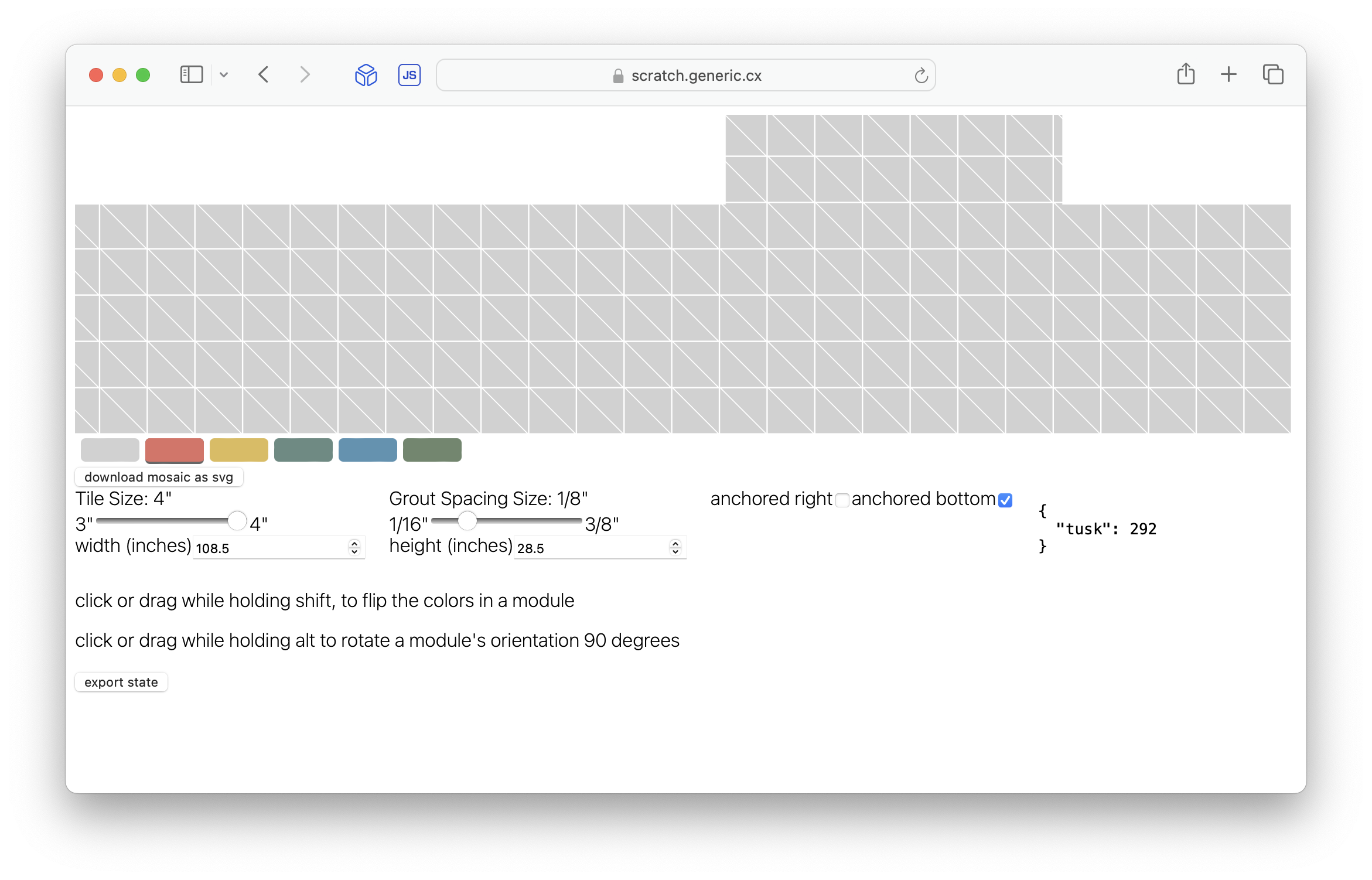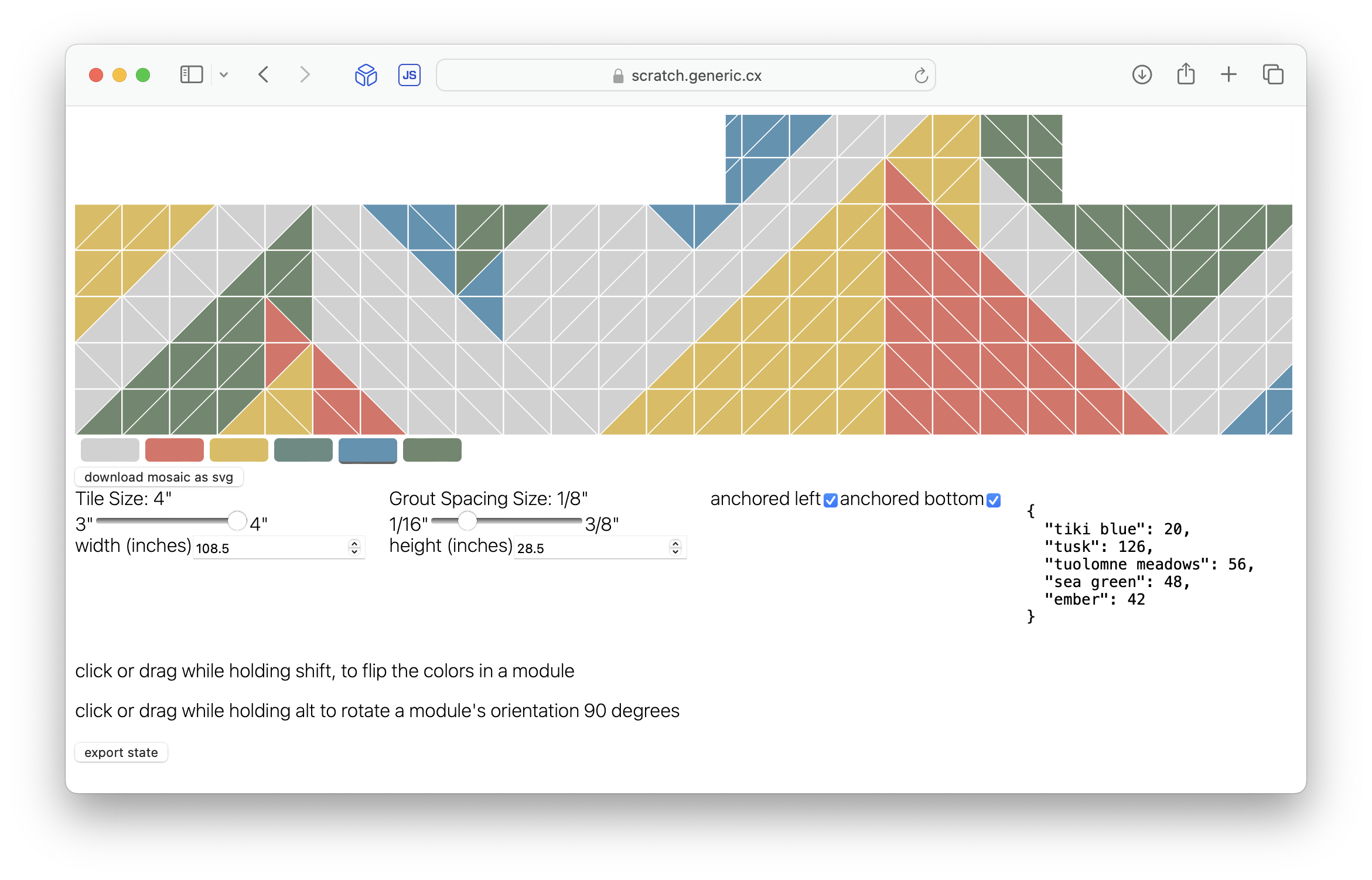 using a subset of fireclay tile's colors we had already decided on, we settled on a triangular module system. for this, i built a web based mosaic-design tool, built using react and bundled with parcel. it generates to-scale svgs and emits json documents for sharing state. it accomodates grout spacings as well as several anchoring options for the tiles.