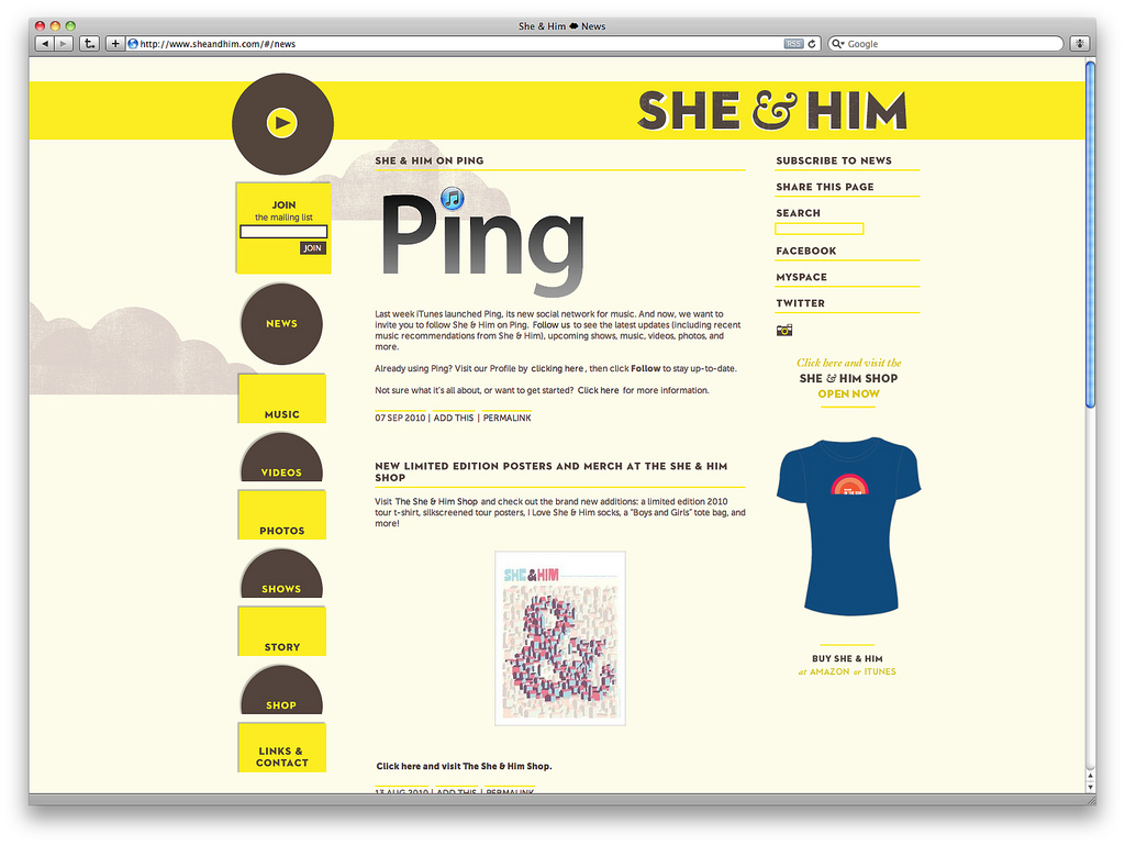 Because the record up top is actually a flash mp3 playing widget, the site is entirely loaded using jquery-address so that playback is uninterrupted. This was added in at the very end so that we could have actual permalinks for the entire site that did the right thing and also so that the site could be scraped correctly. Because all of the pages actually exist, but can be pulled into the main site via xhrs, we have a site that crawls well but also works nicely interactively. Sharing via AddThis because they had a much better api, avoid ShareThis like the plague, they totally did not have their act together.