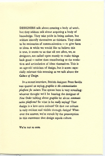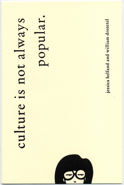 The second is a quarto leaflet of hand-composited 10pt Monotype Garamond. The cover is printed using two magnesium plates. The text is from Helfand and Drenttel's eponymous "Culture is not Always Popular"
