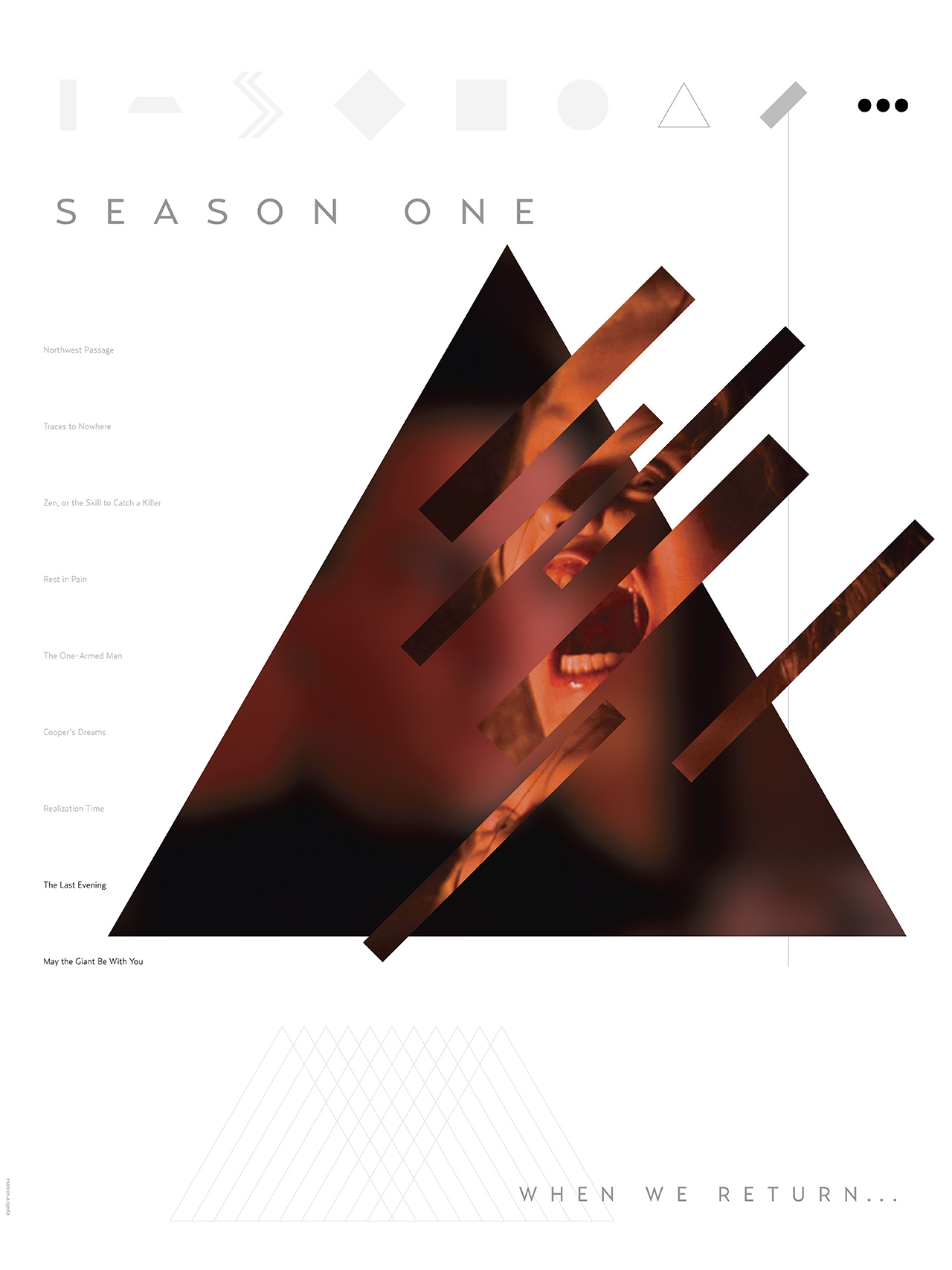 I built a visual iconographic system for the entire first season and then played it out in the three posters. The cliffhanger is present in a single image which is no longer a recap, but the moment between episodes where we guess at future events and construct a world of possible meanings.