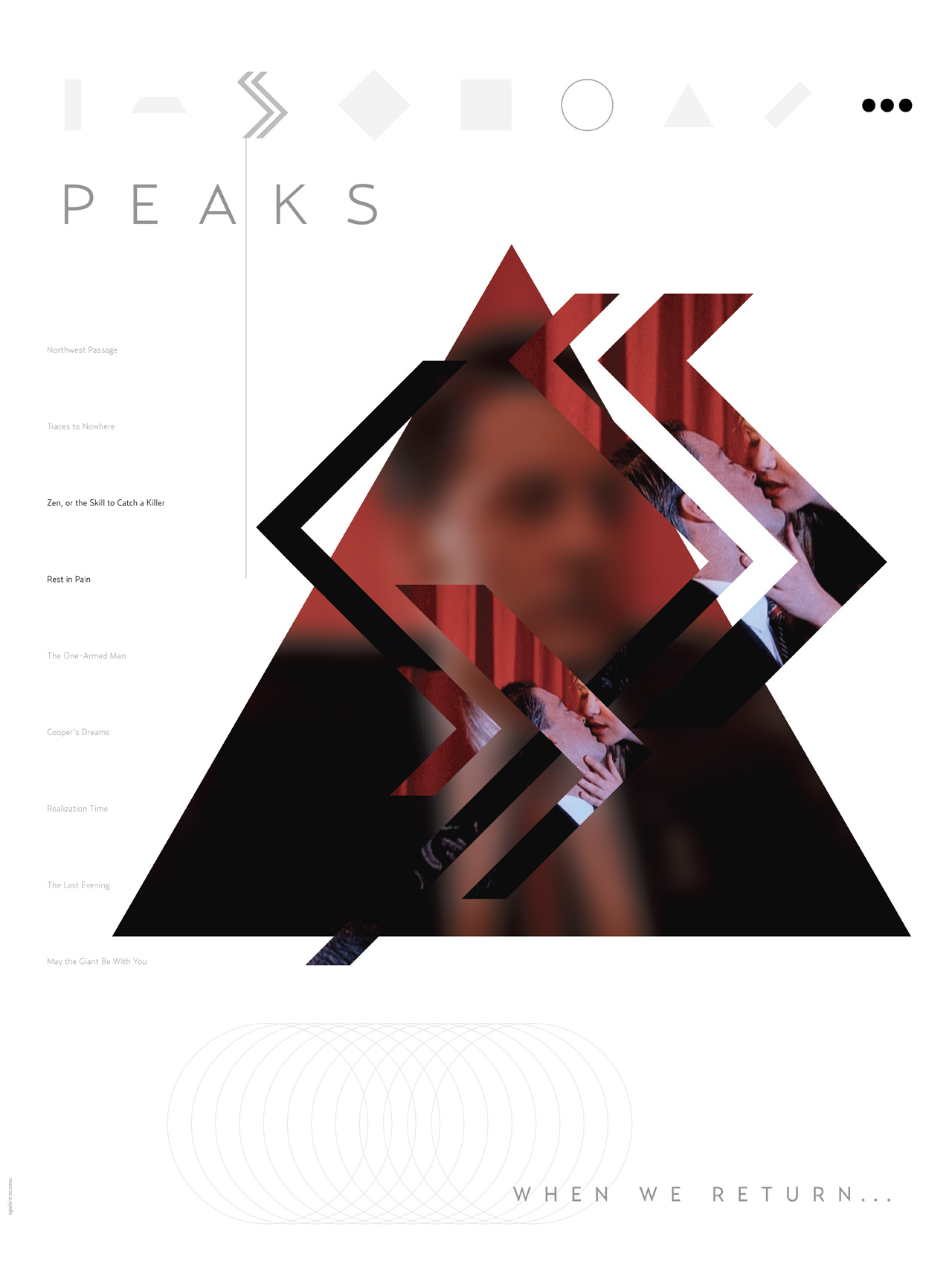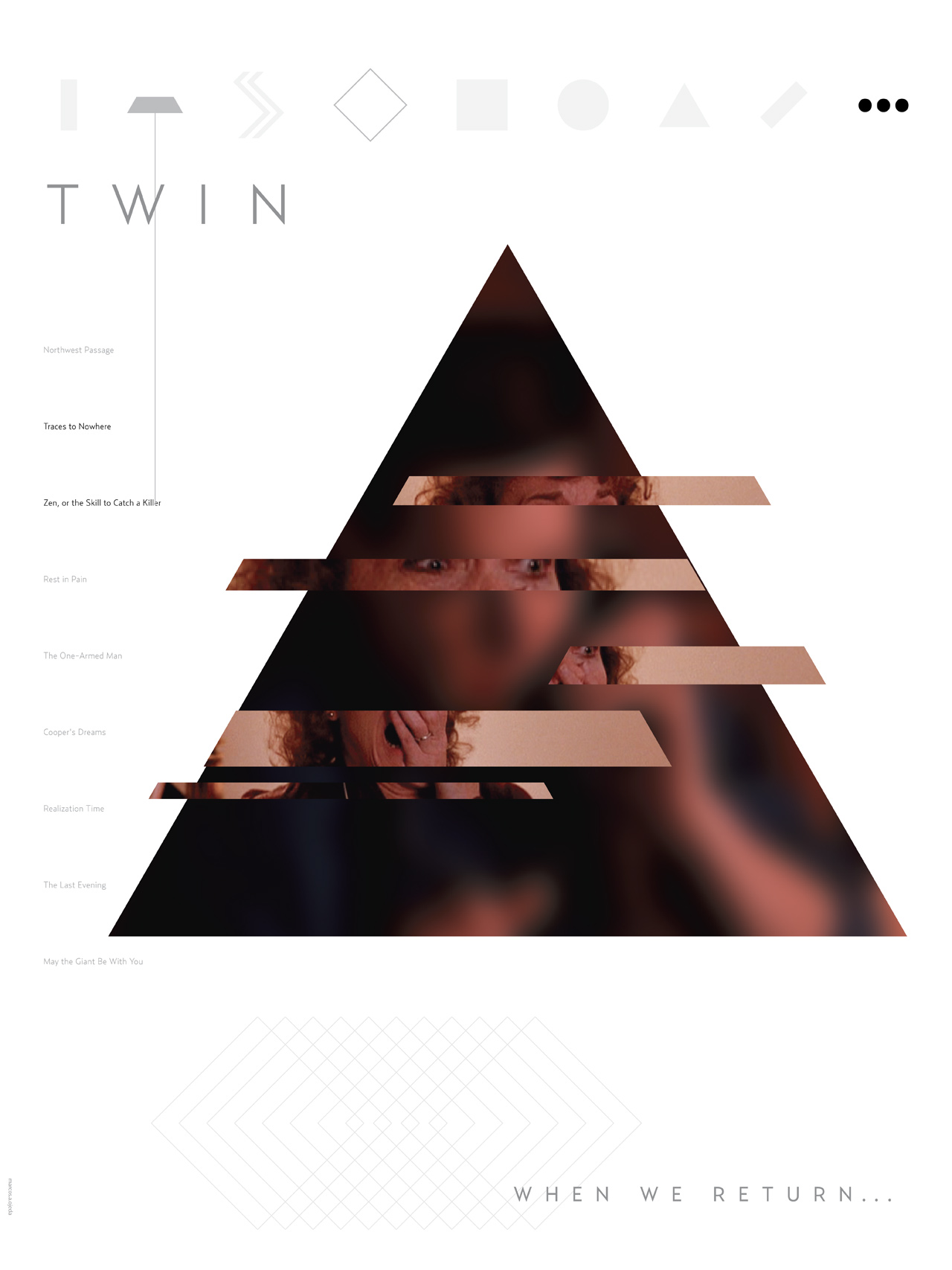 This in mind, I set upon doing a visual study of the first and last keyframes of the first season of Twin Peaks (and also all six star wars movies). For each poster, I chose a constant element from each episode (agent cooper) and an element from the beginning of the next episode (the intersecting shapes).